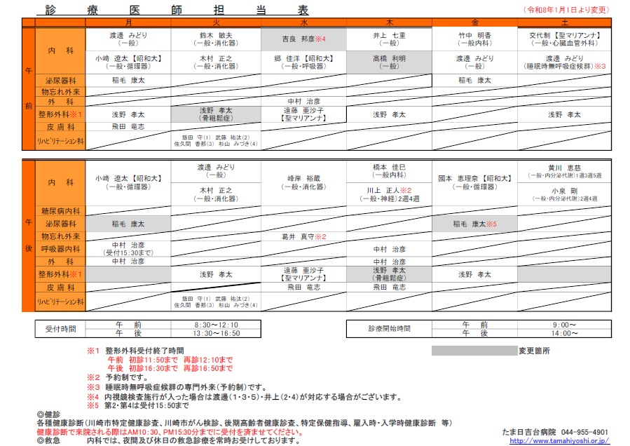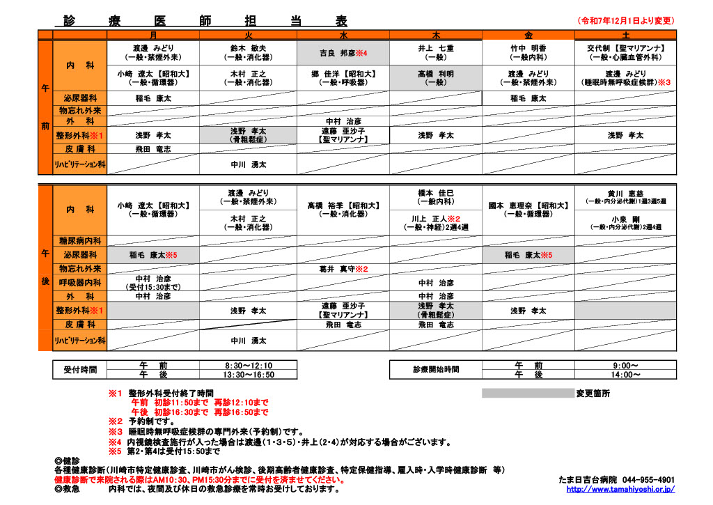 2025.11.28 【整形外科】 外来担当医一部変更のお知らせ いつも当院の診療にご理解とご協力を賜り、誠にありがとうございます。 この度、整形外科の外来担当につきまして、下記のとおり診療日程を一部変更いたします。 ■ 変更内容月曜午後の整形外科外来 → 休診(削除) 土曜午後の整形外科外来 → 休診(削除) ■ 適用開始日2025年12月1日(月)〜 ご来院いただく皆さまにはご不便をおかけいたしますが、 ご理解くださいますようお願い申し上げます。
